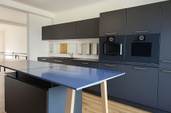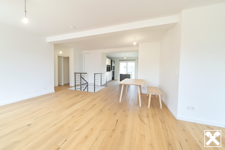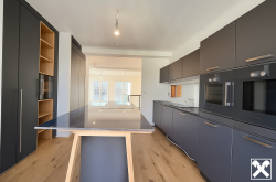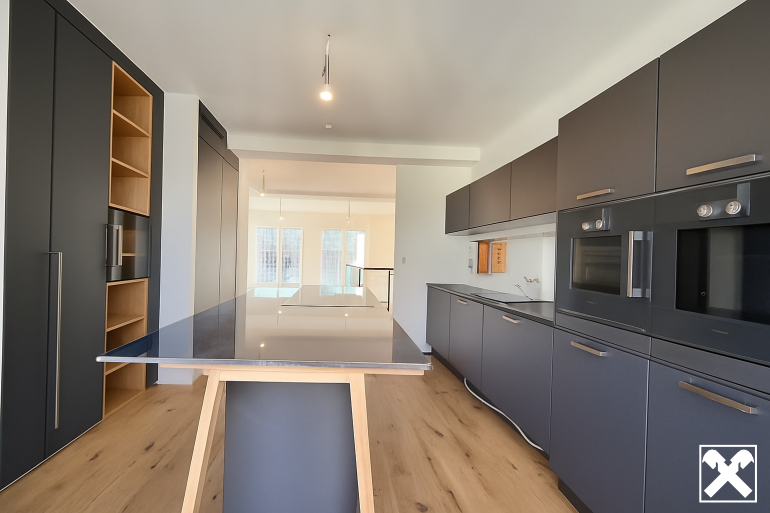 In der oberen Ebene befindet sich der fast 70 m² große ost-westseitig orientierte und sehr helle Wohnraum mit voll möblierter offener Küche sowie ein weiteres Schlafzimmer und ein separates WC.