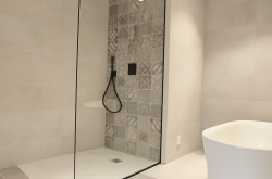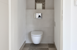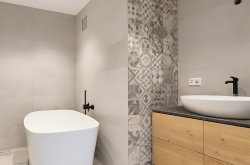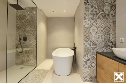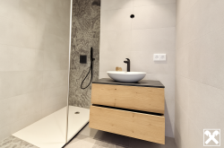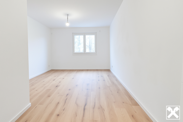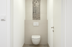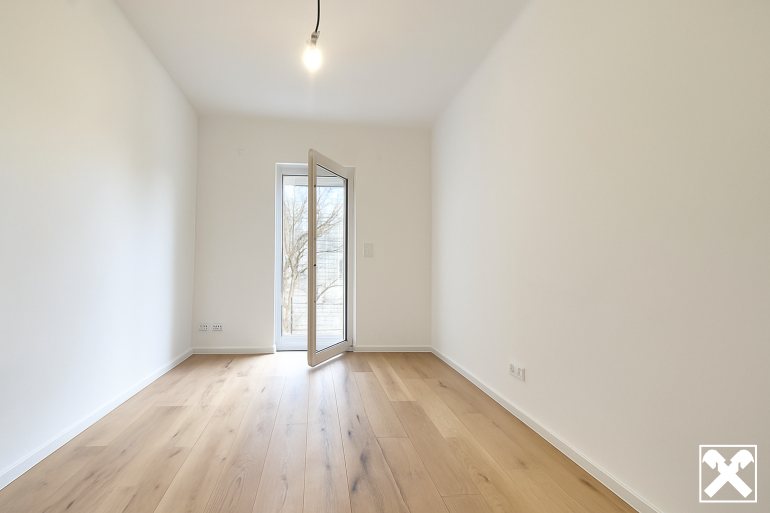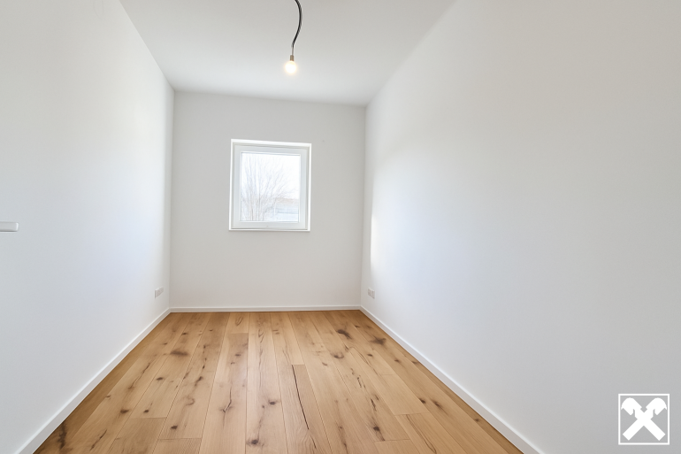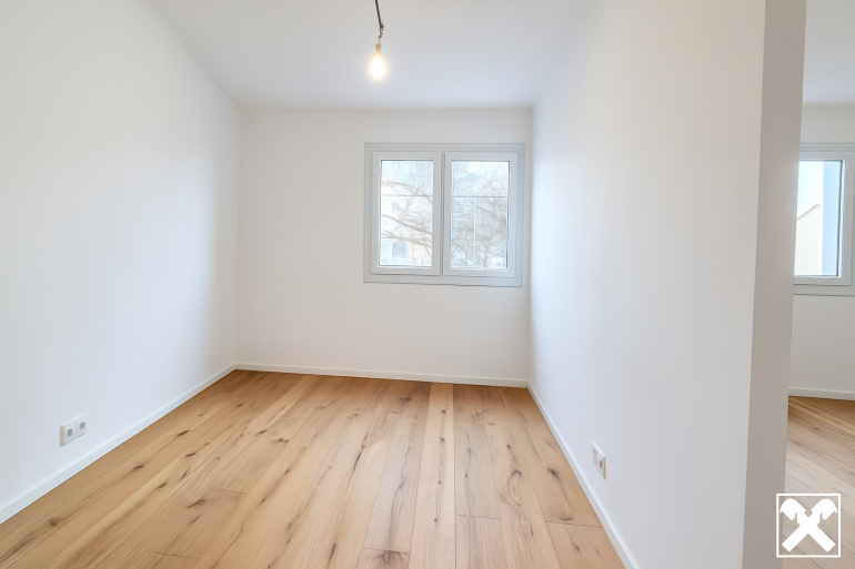 Von diesem Vorraum sind drei Zimmer, ein Badezimmer mit Dusche und Waschtisch, ein WC und ein Abstellraum zugänglich. Von einem der Zimmer ist der Ausgang auf eine hofseitige Terrasse möglich, über das größte der Zimmer ist ein weiteres Schlafzimmer sowie ein großzügiges zweites Badezimmer mit freistehender Wanne, offener Dusche sowie Waschtisch erreichbar.