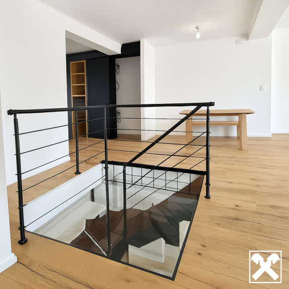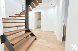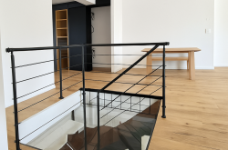 Über den Haupteingang in der unteren Ebene betritt man einen großzügigen Vorraum in dem das zentrale Element ein luftige Treppe bildet die die beiden Ebenen verbindet.