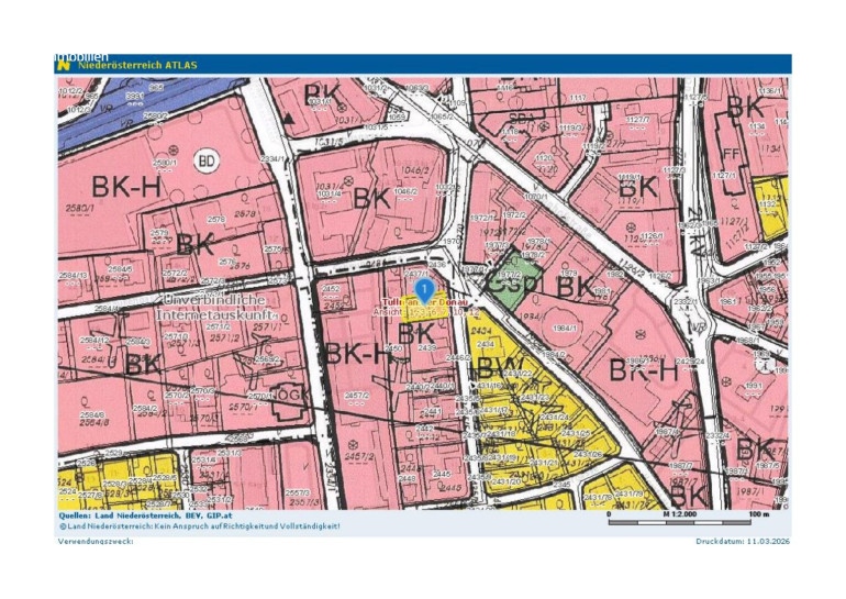 Die Liegenschaft ist als Bauland-Kerngebiet (BK) gewidmet, ein weiterer Parameter, welcher für das Grundstück spricht ist, dass kein Bauzwang vorhanden ist. Die Widmung als Bauland-Kerngebiet in Bauklasse I, II lässt eine 40%ige Bebauung in offener, oder gekuppelter Bauweise, gemäß der beiliegenden Verordnung zu.