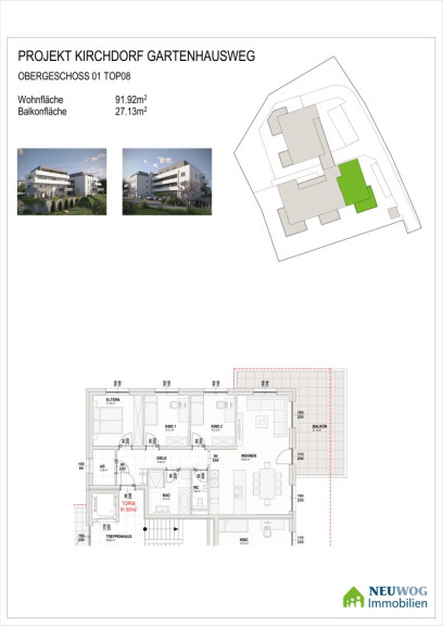 Die Immobilie befindet sich am Gartenhausweg in 4560 Kirchdorf an der Krems, einer Stadt in Oberösterreich. Sie liegt in einer ruhigen Gegend, in bester Zentrumslage in einer Sackgasse. Die 18 Wohneinheiten werden, im für die Fa. Neuwog üblichen, gehobenen Standard errichtet. NEUWOG steht für herzliche Betreuung und zufriedene Kunden!Beschreibung der Immobilie