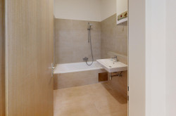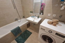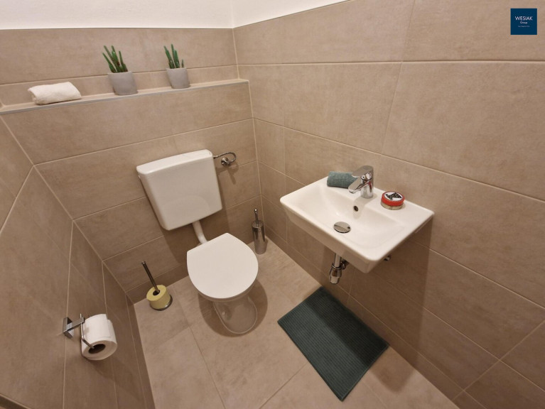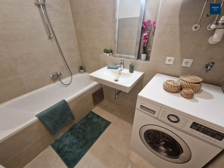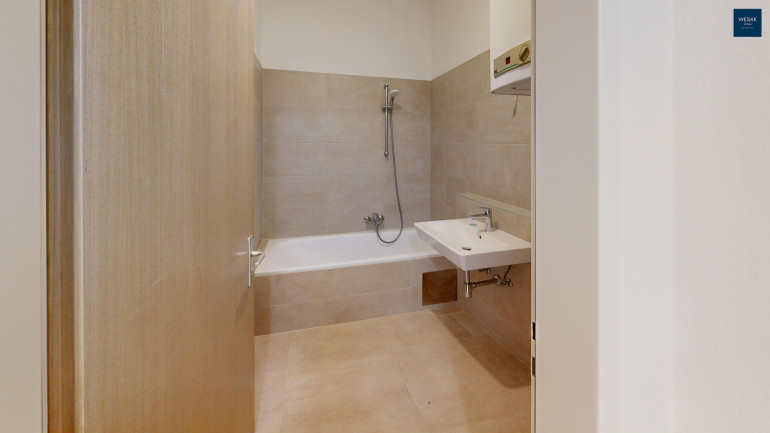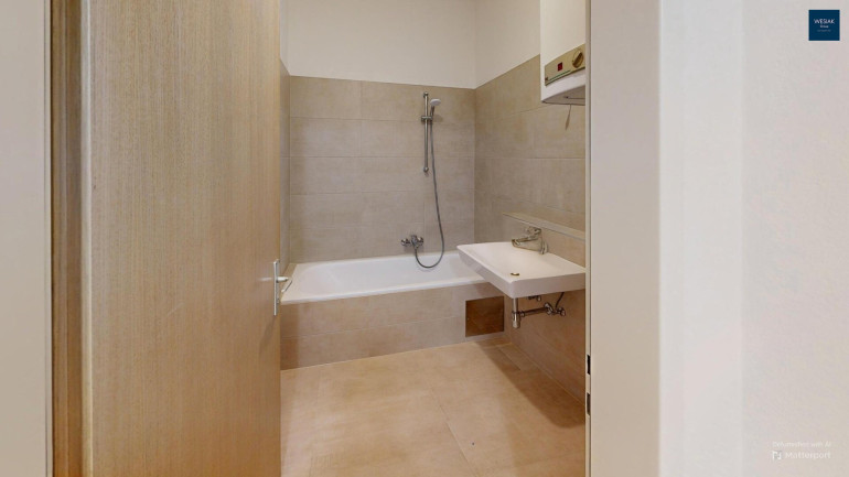 Das vom WC getrennte Badezimmer ist mit einer Badewanne ausgestattet und lädt zum Entspannen und Abschalten ein. Außerdem bietet das Badezimmer ausreichend Platz und die Anschlüsse für die Waschmaschine. Weiters sind die neuwertige, voll ausgestattete Einbauküche und ein der Wohnung zugeordneter Parkplatz der im Kaufpreis inbegriffen ist.