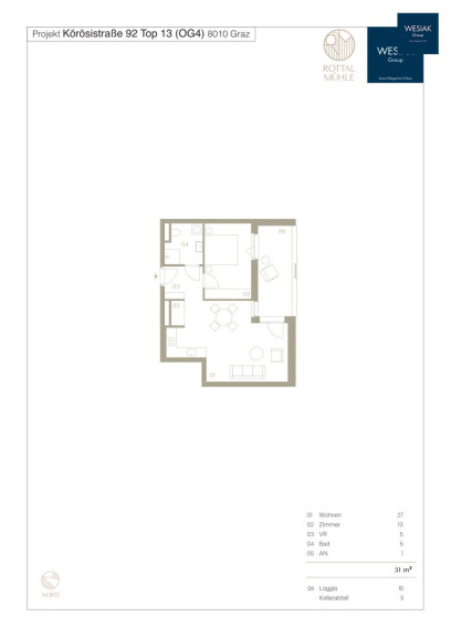 Ein offener Wohn- und Essbereich mit Zugang zur Loggia bildet das Herzstück der Wohnung. Das Schlafzimmer bietet einen ruhigen Rückzugsort, während das modern gestaltete Badezimmer, der Vorraum und ein Abstellraum das Raumkonzept optimal ergänzen.