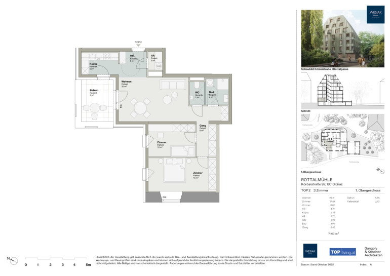 Ein großzügiger Wohn- und Essbereich bildet das Herzstück der Wohnung und bietet einen direkten Zugang zum Balkon. Ein modern gestaltetes Badezimmer, ein separates WC, ein Vorraum sowie ein praktischer Abstellraum vervollständigen das Raumangebot.