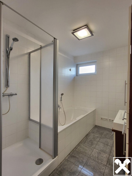 Das Badezimmer verfügt über Badewanne und Dusche, sowie Fenster zum Lüften.