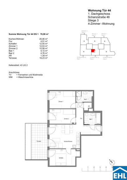 Die Wohnung selbst befindet sich im 1. Dachgeschoss und verfügt über eine großzügige Wohnküche mit vollausgestatteter Einbauküche und Zugang zur Terrasse, drei Schlafzimmer, ein Badezimmer mit Dusche, Waschmaschinenanschluss und WC, sowie einen Vorraum. Die dazugehörige Terrasse lädt zum gemütlichen Verweilen ein und rundet das Wohnerlebnis perfekt ab!