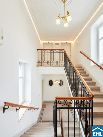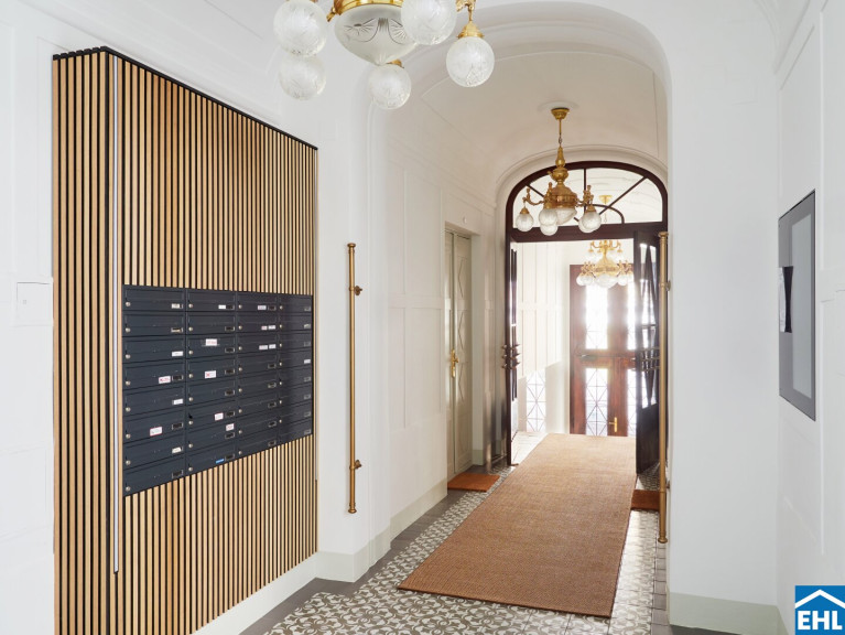 Moderne und zugleich edle Elemente, wie die ansprechenden Holzverkleidungen im Eingangsbereich sowie das digitale schwarze Brett, gepaart mit dem eleganten, original erhaltenen Stiegengeländer und der wunderschönen Luster, verleihen dem Haus einen ganz besonderen Charme.