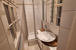 - kleines Badezimmer mit Dusche und mit Fenster auf die Gangseite