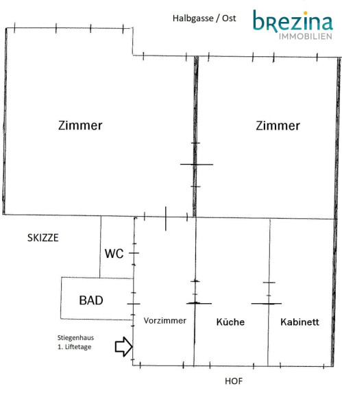 - 3 Zimmer - 2 große Zimmer auf die Halbgasse mit einem Durchgangszimmer - OST - und ein kleines Kabinett auf die Hofseite nach West