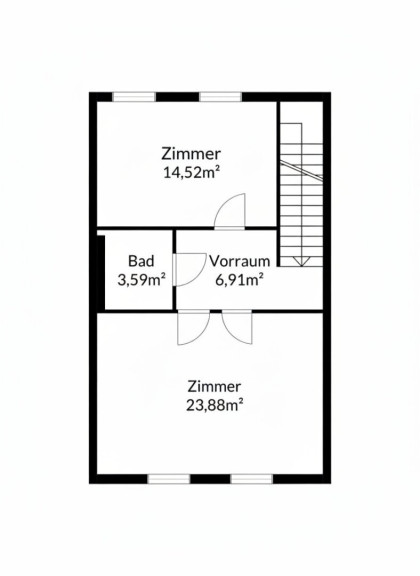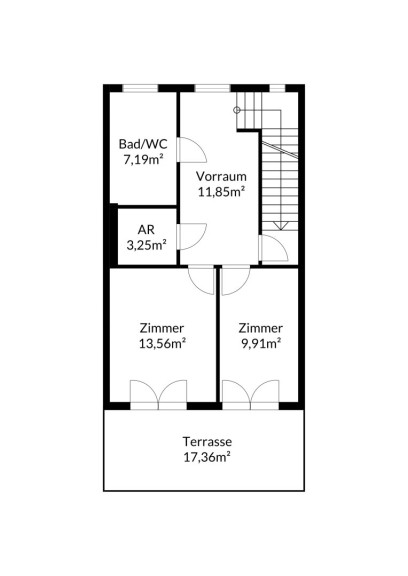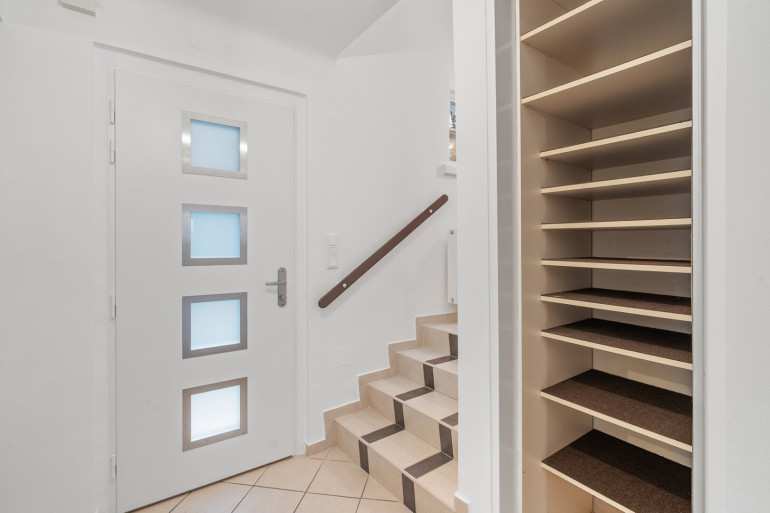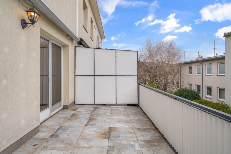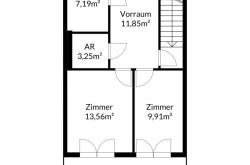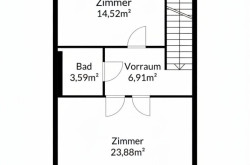 Im 1. Obergeschoss stehen zwei helle Zimmer zur Verfügung, die bei Bedarf wieder zu einem großzügigen Raum zusammengelegt werden können. Ergänzt wird diese Ebene durch ein großzügiges Badezimmer mit WC sowie einen praktischen Abstellraum. Besonders hervorzuheben ist der ca. 17 m² große Balkon, der von dieser Ebene aus zugänglich ist und dank seiner Größe und Ausrichtung für viel Tageslicht und ein angenehmes Wohnambiente sorgt.