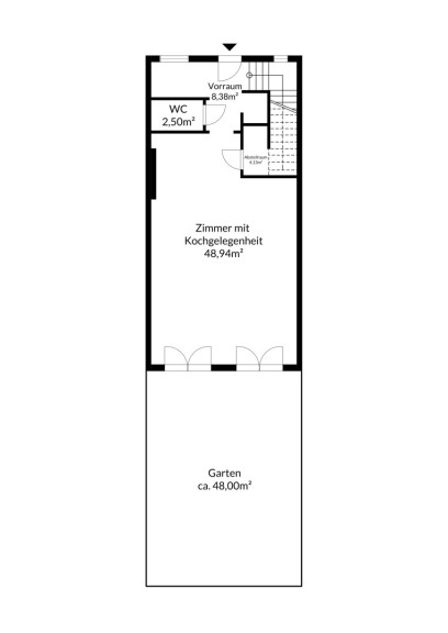 Das Erdgeschoss bildet das Herzstück des Hauses. Hier befindet sich der offen gestaltete Wohn und Essbereich, der durch seine großzügige Raumwirkung und große Fensterflächen besticht. Von hier aus gelangt man direkt in den privaten, liebevoll begrünten Garten mit ca. 48 m², der als Rückzugsort im Freien dient und sowohl Platz für Entspannung als auch für geselliges Beisammensein bietet.