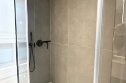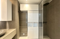 + Duschbad mit Waschbecken, Spiegel, Unterbauschrank, Oberschränken, weiterem Schrank sowie Handtuchwärmer