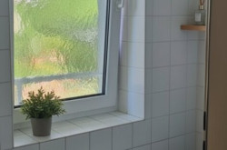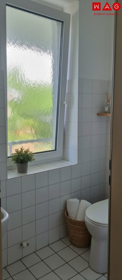 - WC- und Badbereiche mit weißen Fliesen gestaltet