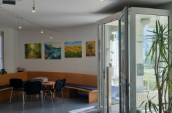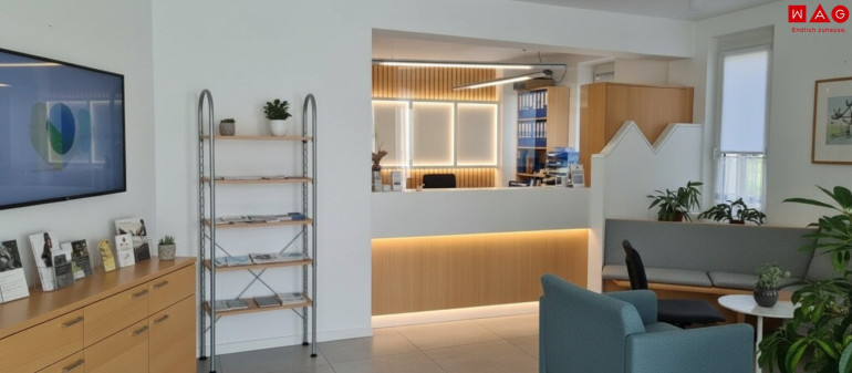 - Großzügiger Warteraum mit fest eingebautem Empfangstresen, ergänzt durch einen Plexiglasschutz für Hygiene und Sicherheit
