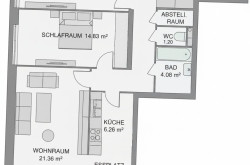 Raumaufteilung: Vorraum/ Flur, Abstellraum, WC separat, Bad (mit Badewanne und WM-Anschluss), Küche eingerichtet (mit Essbereich), Wohnzimmer mit Ausgang auf die Loggia, zwei Schlafzimmer; Kellerabteil, Tiefgaragen-Stellplatz