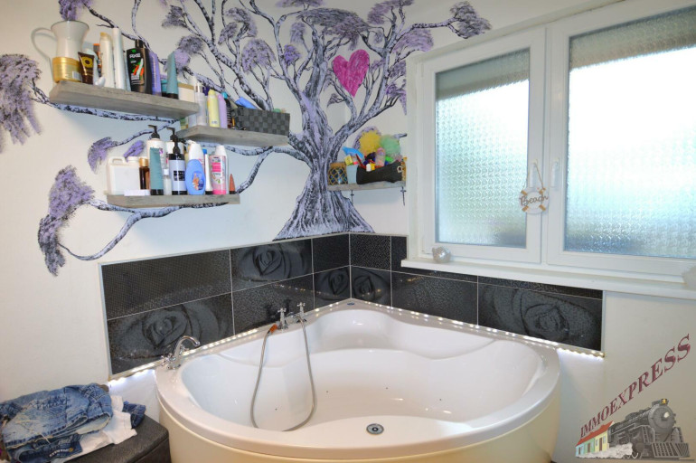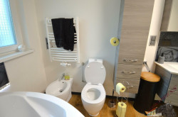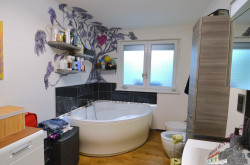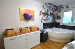 - Badezimmer mit Eckbadewanne, Dusche, WC, Bidet, Doppelwaschbecken, Handtuchheizkörper und Fenster
