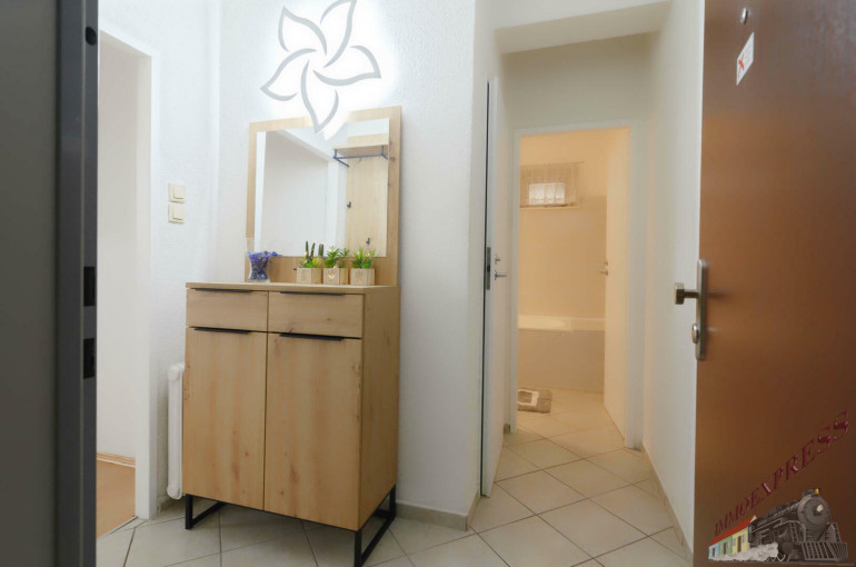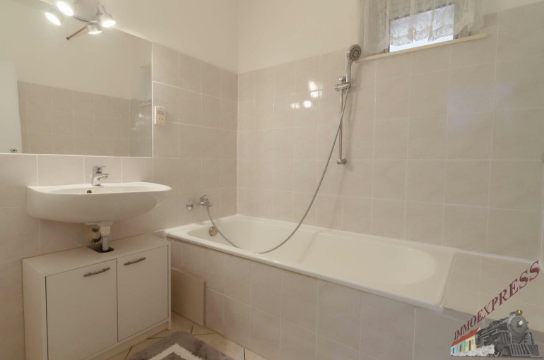 - Aufteilung: Wohnzimmer mit integrierter Küche, Schlafzimmer, Badezimmer mit Badewanne, separates WC