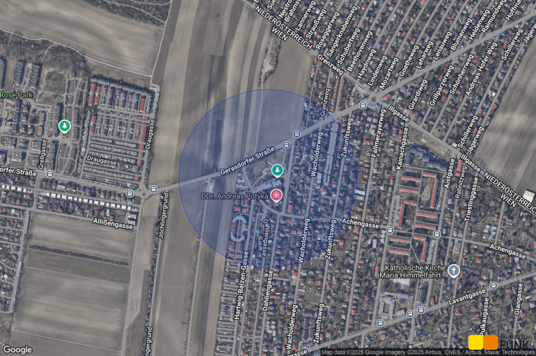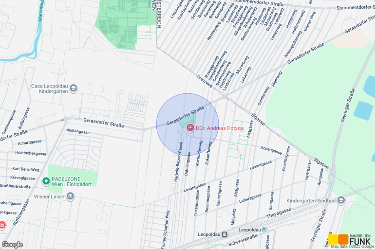 Die Anbindung an den öffentlichen Verkehr erfolgt über die Autobuslinie 32A (Haltestelle Dahliengasse, ca. 200 m). Damit erreichen Sie in ca. 7 Minuten Fahrzeit die U1-Station Leopoldau. Mit dem Auto erreichen Sie in ca. 25 Minuten das Zentrum Wiens (Stephansplatz) und in knapp über einer halben Stunde den Flughafen Wien-Schwechat.