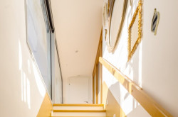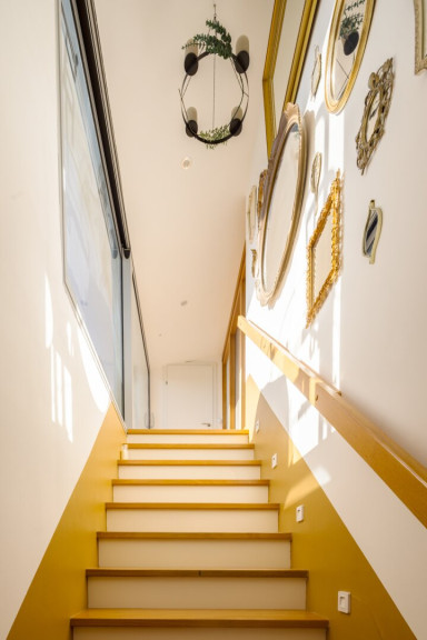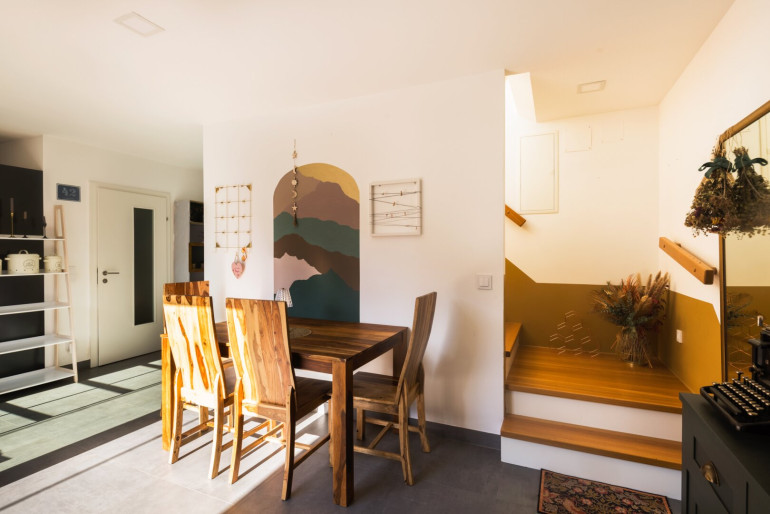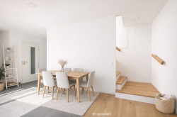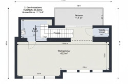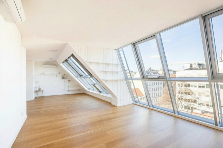 Über eine interne Treppe erreicht man die obere Ebene der Wohnung. Hier befindet sich ein rund 42 m² großes Wohnzimmer mit großzügiger Fensterfront über die gesamte Raumhöhe, wodurch ein heller und offener Wohnbereich entsteht. Vom Vorzimmer aus gelangt man auf eine weitere Terrasse mit etwa 11 m², ebenfalls hof- und südseitig ausgerichtet. Derzeit ist das Wohnzimmer oben vom Stiegenhaus mittels Holzriegelwand getrennt, diese kann jederzeit entfernt werden.