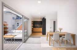 Beschreibung: Beim Betreten der Wohnung gelangt man in einen offenen Vorraum, der direkt in die rund 30 m² große, hofseitig gelegene Wohnküche führt. Große Fensterflächen sorgen für eine angenehme Belichtung des Raumes. Von der Wohnküche aus besteht Zugang zu einer etwa 11 m² großen Terrasse mit südseitiger Ausrichtung zum Innenhof.