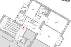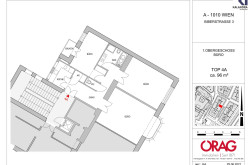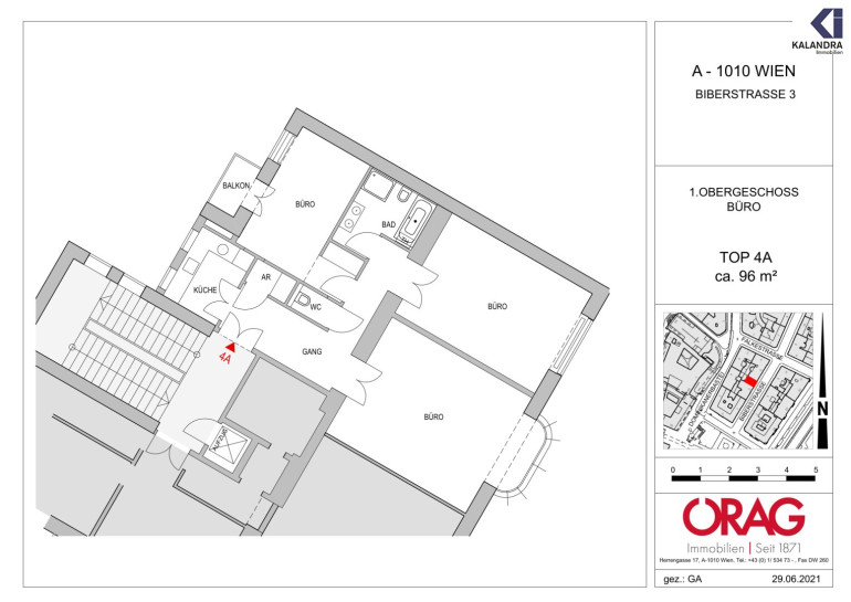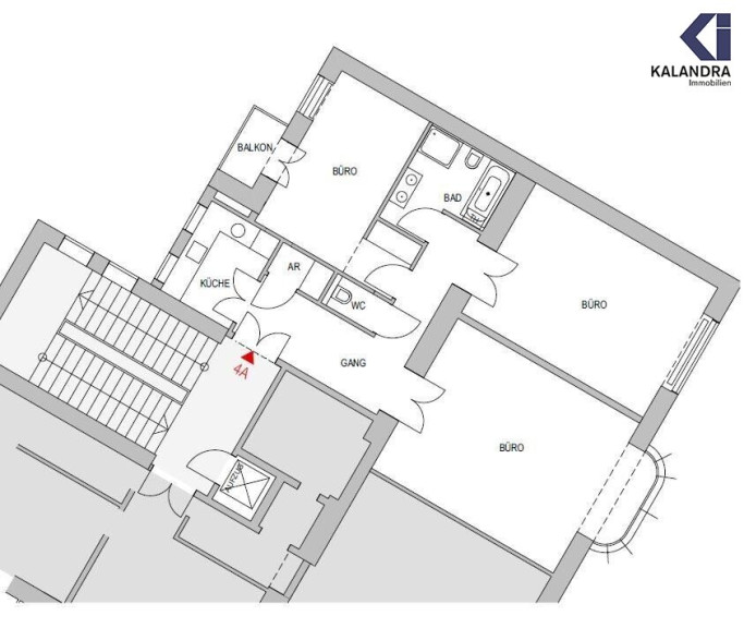 Vorraum/Gang, 3 zentral begehbare Büroräume, Küche, Balkon, Wannenbad mit Dusche und WC, separates WC, Abstellraum
