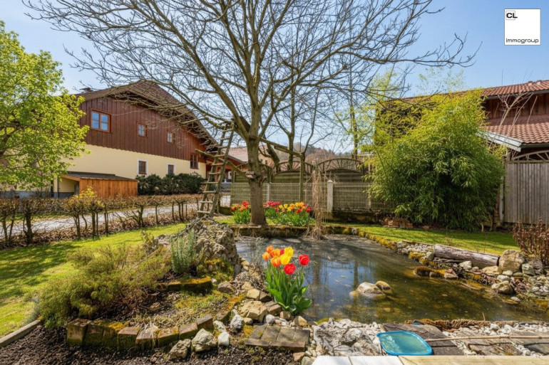 Der großzügige Garten mit Pool und idyllischem Fischteich lädt zum Entspannen, Baden und Genießen ein – ein echtes Highlight für warme Sommertage und gemütliche Stunden im Freien.