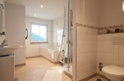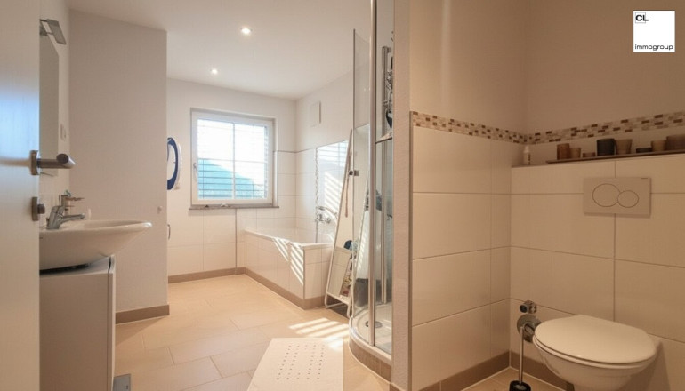 Ein besonderes Highlight ist das großzügige Badezimmer: hell und freundlich gestaltet, mit Fenster, Badewanne und Dusche ausgestattet – ein Ort zum Abschalten und Wohlfühlen.