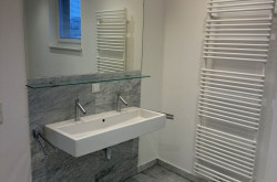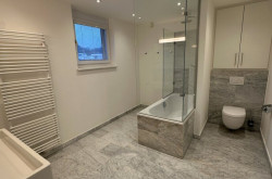 - Badezimmer 2 mit Raimshower-Dusche Waschbecken, Handtuchtrockner, WC und Fenster