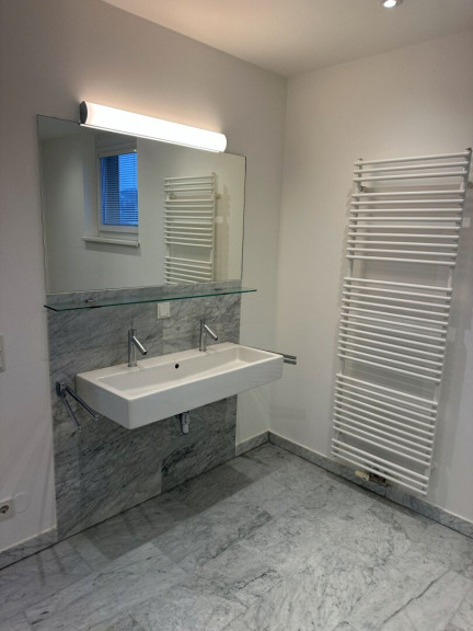 - Badezimmer 1 mit Badewanne, Doppelwaschbecken, Handtuchtrockner, WC und Fenster