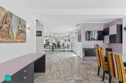 Ein weiterer Hingucker: das großzügige Wellness-Badezimmer im eleganten Rosa-Marmor-Design, ausgestattet mit Dusche, WC, Bidet, Waschmaschinenanschluss und einer Infrarotkabine.