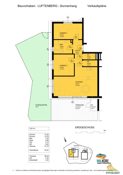 Die Wohnung TOP A1 befindet sich im Erdgeschoss von Haus A und bietet mit rund 77 m² Wohnfläche ein modernes Zuhause mit angenehmem Wohnkomfort.