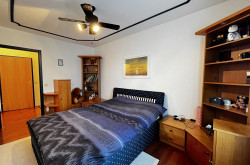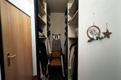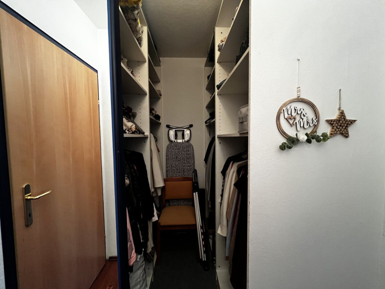 Im Schlafzimmer befindet sich zusätzlich ein begehbarer Kleidungsraum, der ausreichend Platz für Kleidung und zusätzlichen Stauraum bietet.