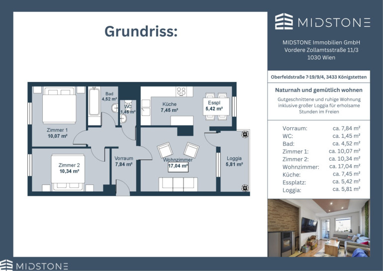 Die Wohnung befindet sich in einer ruhigen und gut gepflegten Wohnanlage in Königstetten, einer charmanten Gemeinde unweit von Tulln. Die Lage bietet ein angenehmes, familienfreundliches Umfeld mit viel Grünraum und einer entspannten Wohnatmosphäre. Zugleich profitiert man von der Nähe zur Stadt Tulln, wo ein umfangreiches Angebot an Einkaufsmöglichkeiten, Gastronomie, Schulen und Freizeiteinrichtungen zur Verfügung steht. Die Anbindung ist komfortabel, da Königstetten sowohl mit dem Auto als auch mit öffentlichen Verkehrsmitteln gut erreichbar ist. Busverbindungen führen regelmäßig nach Tulln und weiter Richtung Wien. Die Umgebung lädt zu Spaziergängen, Radtouren und Aktivitäten in der Natur ein und bietet damit einen hohen Erholungswert. Insgesamt verbindet die Lage eine ruhige, naturnahe Wohnqualität mit guter Erreichbarkeit der umliegenden Städte und macht das Objekt besonders attraktiv für all jene, die Wohnen im Grünen mit praktischer Infrastruktur schätzen.Beschreibung der Immobilie