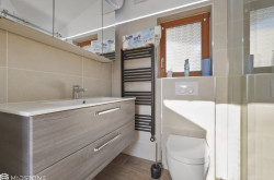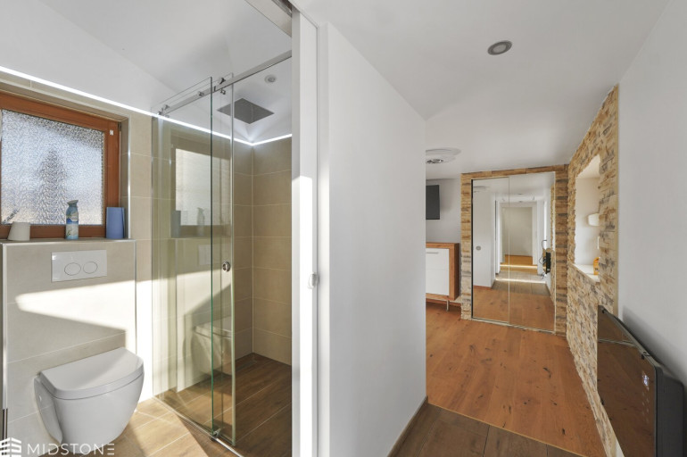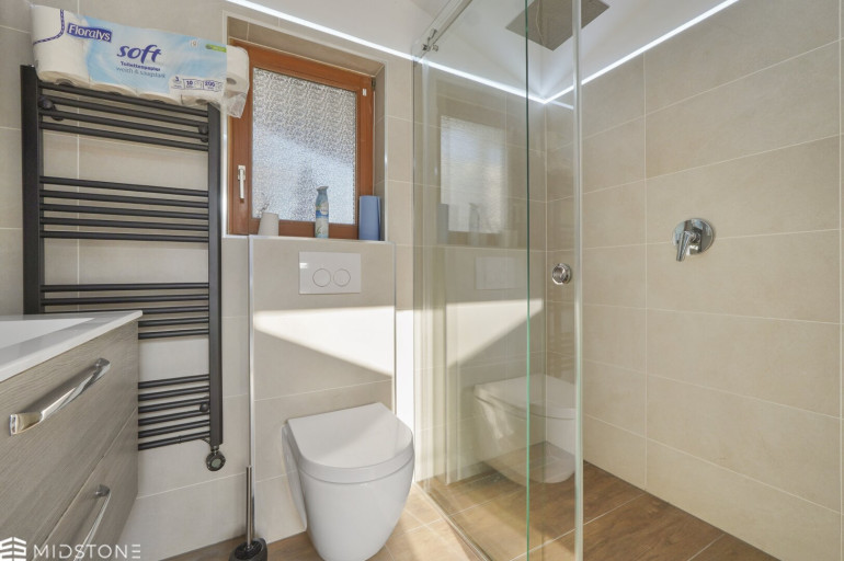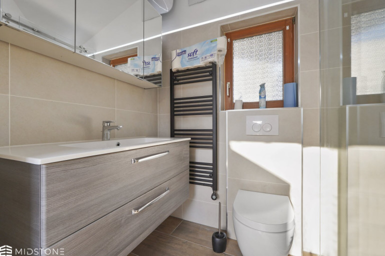 Das Badezimmer verfügt über ein Fenster und eine moderne Dusche. Durch das natürliche Tageslicht wirkt der Raum besonders freundlich und bietet eine angenehme Atmosphäre.