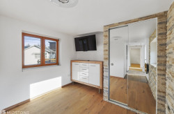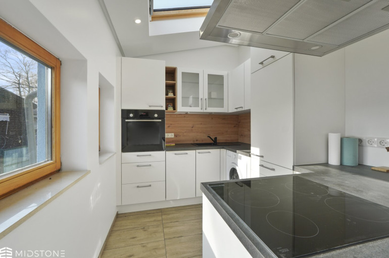 Der Mittelpunkt des Hauses ist die offene Wohnküche mit moderner Einbauküche. Hier entsteht ein einladender Wohnbereich, der sich ideal für entspannte Stunden oder gesellige Abende eignet. Hochwertige Materialien wie Parkett und stilvolle Fliesen sorgen für eine harmonische Kombination aus Design und Wohnkomfort. Die integrierte Fußbodenheizung im Küchenbereich und im Badezimmer schafft dabei ein angenehmes Raumklima zu jeder Jahreszeit. Zusätzlich ist eine Klimaanlage vorhanden.