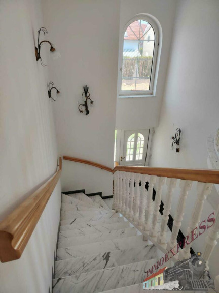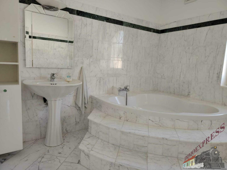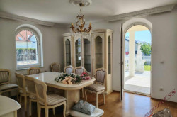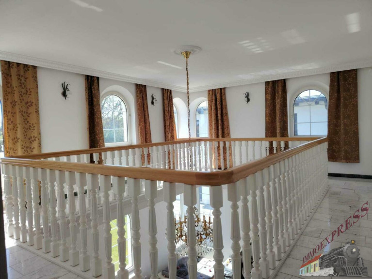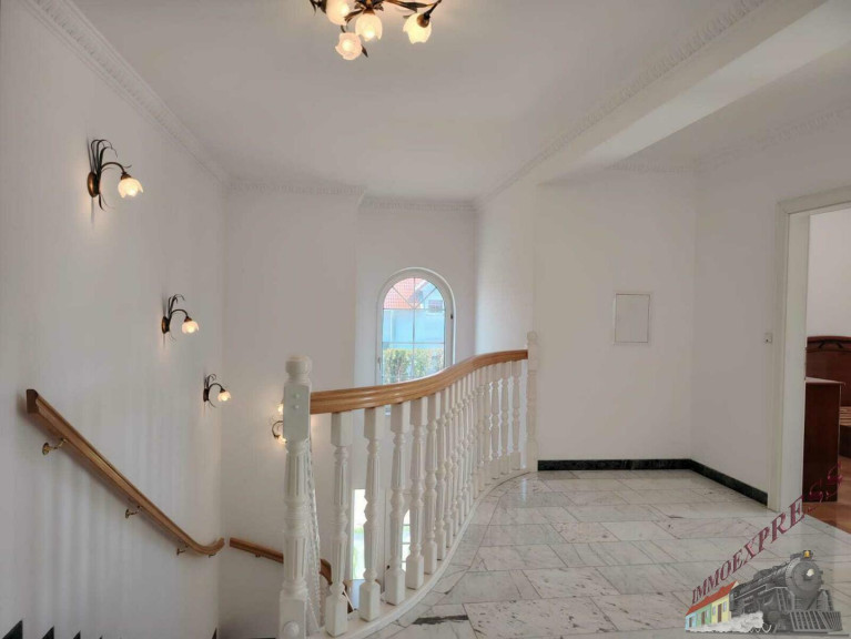 Besonders hervorzuheben ist der stilvolle Eingangsbereich mit Säulen und großer Terrasse, der große Wohnbereich mit einer Marmortreppe, stilvollem Kamin und einem großen Atelier mit Blick in das Wohnzimmer. Das Haus ist mit 38cm Außenwänden stabil gebaut und ist komplett unterkellert. Geheizt wird mit einer Gasheizung, wobei die Marmorböden mit Fußbodenheizung, die Räume mit Parkett über Radiatoren beheizt werden. Für das Warmwasser sorgt eine Wärmepumpe und der Kamin im Wohnzimmer kann mit Holz beheizt, zusätzlich für wohlige Wärme sorgen.
