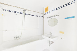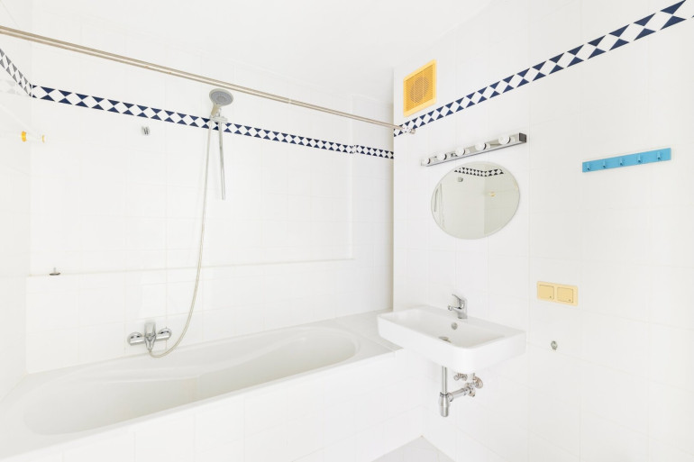 Das Badezimmer ist funktional gestaltet und mit einer Badewanne sowie einem Waschbecken ausgestattet. Das separate WC stellt einen zusätzlichen Komfort dar und rundet das Raumangebot praktisch ab.