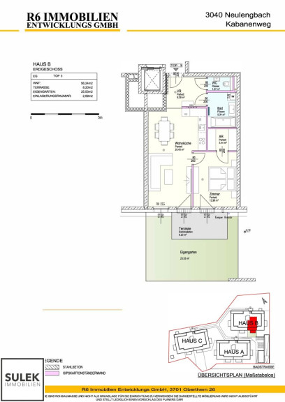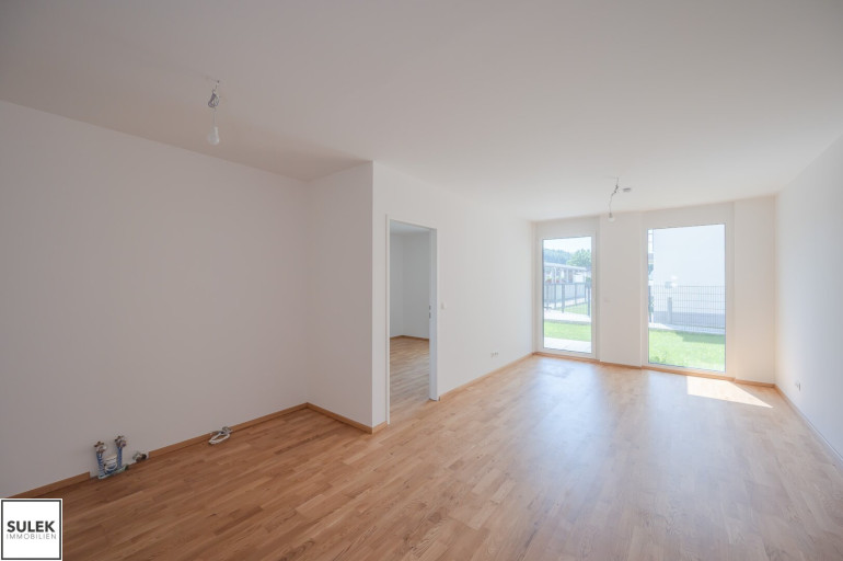 Die Wohnung Top 3 im Erdgeschoß von Haus 2 bietet auf 56,2 m² ein durchdachtes Raumprogramm mit Vorraum, zwei Zimmern, Abstellraum, Badezimmer und separatem WC. Von der Wohnküche führt der Ausgang auf die Terrasse mit anschließendem Garten, die den Wohnraum um wertvolle Freifläche erweitert. Eichen-Echtholz-Parkett, großformatige Fliesen mit hochwertiger Keramik in den Nassräumen sowie eine Sicherheits-Eingangstüre runden das Gesamtpaket ab und sorgen für Wohnkomfort auf zeitgemäßem Niveau. Zusätzlich gehören ein Kellerabteil sowie optional verfügbare Garagenplätze in der Tiefgarage zum Angebot.