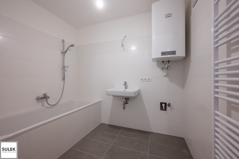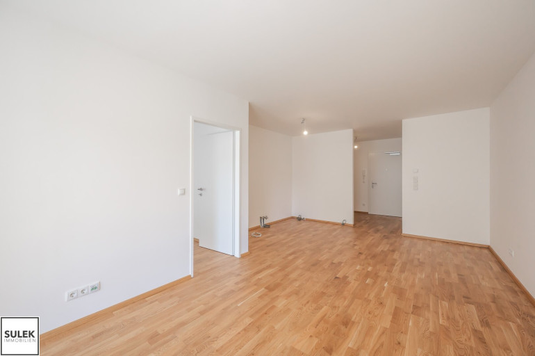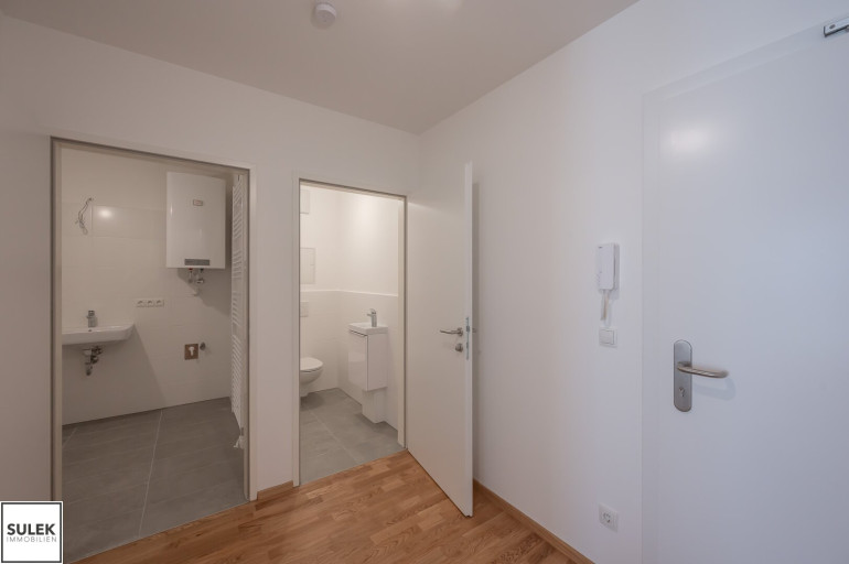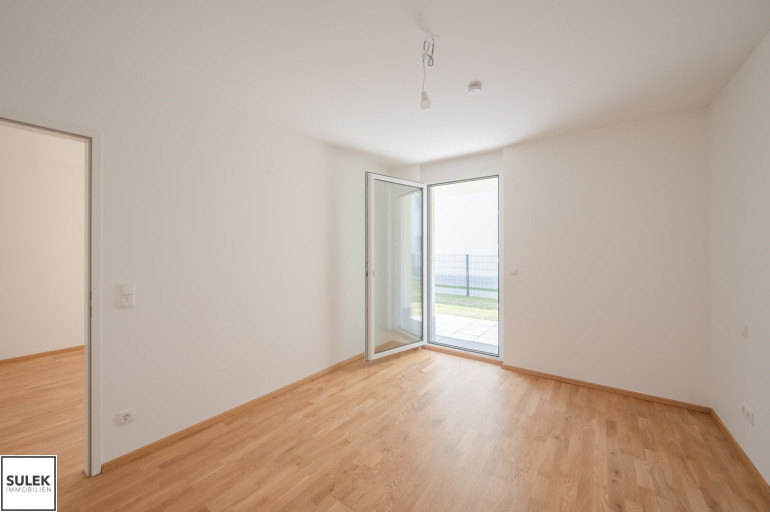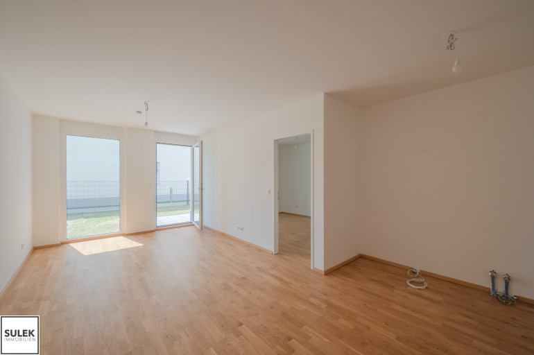 Die Wohnung Top 2 im Erdgeschoß von Haus 2 bietet auf 56,4 m² ein durchdachtes Raumprogramm mit Vorraum, zwei Zimmern, Abstellraum, Badezimmer und separatem WC. Von der Wohnküche führt der Ausgang auf die Terrasse mit anschließendem Garten, die den Wohnraum um wertvolle Freifläche erweitert. Eichen-Echtholz-Parkett, großformatige Fliesen mit hochwertiger Keramik in den Nassräumen sowie eine Sicherheits-Eingangstüre runden das Gesamtpaket ab und sorgen für Wohnkomfort auf zeitgemäßem Niveau. Zusätzlich gehören ein Kellerabteil sowie optional verfügbare Garagenplätze in der Tiefgarage zum Angebot.