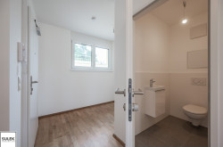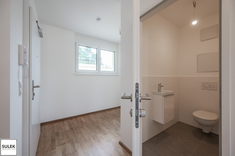 Die Wohnung Top 10 im Dachgeschoß (2. OG) von Haus 1 bietet auf 75,4 m² ein durchdachtes Raumprogramm mit Vorraum, drei Zimmern, Abstellraum, Badezimmer und separatem WC. Von allen Zimmern führt der Ausgang auf die rund 48 m² große Terrasse, die den Wohnraum um wertvolle Freifläche erweitert. Eichen-Echtholz-Parkett, großformatige Fliesen mit hochwertiger Keramik in den Nassräumen sowie eine Sicherheits-Eingangstüre runden das Gesamtpaket ab und sorgen für Wohnkomfort auf zeitgemäßem Niveau. Zusätzlich gehören ein Kellerabteil sowie optional verfügbare Garagenplätze in der Tiefgarage zum Angebot.