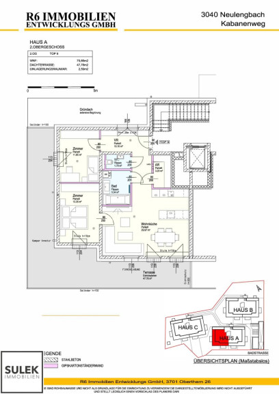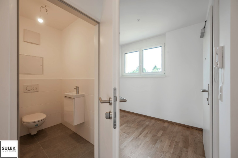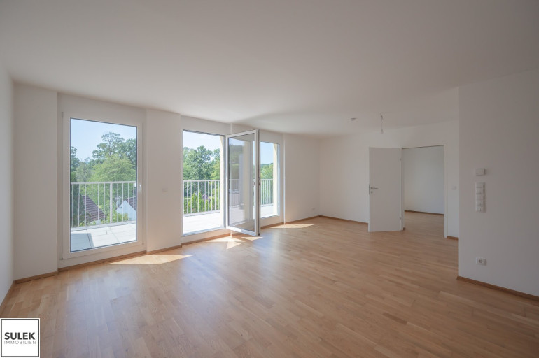 Die Wohnung Top 9 im Dachgeschoß (2. OG) von Haus 1 bietet auf 75,7 m² ein durchdachtes Raumprogramm mit Vorraum, drei Zimmern, Abstellraum, Badezimmer und separatem WC. Von allen Zimmern führt der Ausgang auf die rund 48 m² große Terrasse, die den Wohnraum um wertvolle Freifläche erweitert. Eichen-Echtholz-Parkett, großformatige Fliesen mit hochwertiger Keramik in den Nassräumen sowie eine Sicherheits-Eingangstüre runden das Gesamtpaket ab und sorgen für Wohnkomfort auf zeitgemäßem Niveau. Zusätzlich gehören ein Kellerabteil sowie optional verfügbare Garagenplätze in der Tiefgarage zum Angebot.