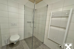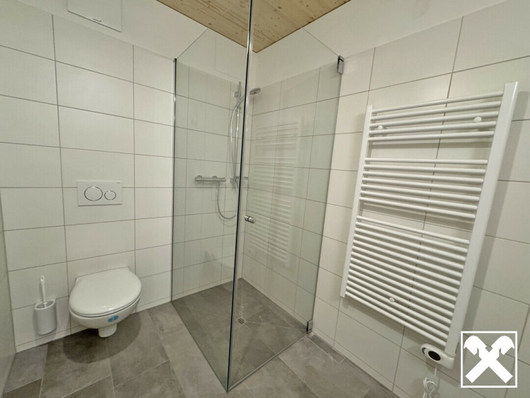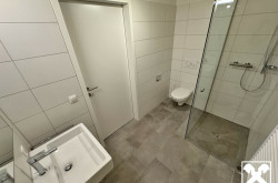 - Badezimmer mit Dusche, WM-Anschluss, Waschbecken und WC