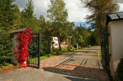 Das Hauptgebäude selbst wirkt durch seine Größe und rustikale Optik wie ein herrschaftliches Jagdschloss mit allen Attributen, wie einem eisernen Einfahrtstor mit einer baumgesäumten Zufahrt, einem Burgturm, mehreren Bachbrücken und klassischen Windläden sowie diversen Jagdtrophäen. Auch die Räumlichkeiten im Inneren sind elegant und charmant, teils opulent und mit viel Liebe zum Detail ausgestattet. Klassisch rustikale Antiquitäten, handgefertigte Holzarbeiten und kostbare Stoffe im Landhausstil stehen für die Tradition des Hauses in seiner Umgebung. Dies macht den besonderen Charme des Anwesens aus. Insgesamt stehen ca. 1.000m² Wohnnutzfläche in insgesamt 20 Zimmern zur Verfügung. Beheizt wird nachhaltig mit Wasserwärmepumpe.