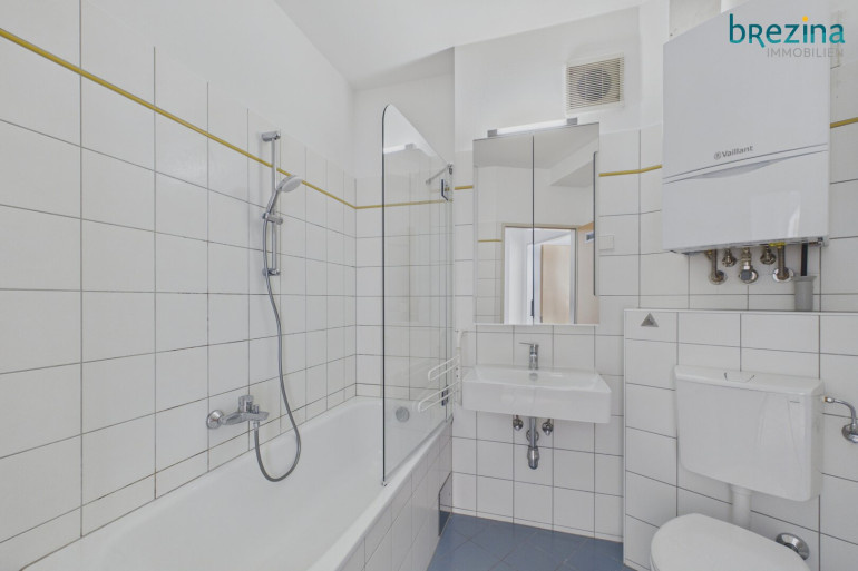 - Badezimmer mit Badewanne, Waschmaschinenanschluss, Toilette und Therme