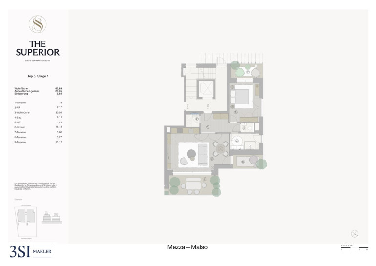 Im Zusammenspiel klarer Linien und präzise gesetzter Details entsteht die architektonische Qualität von THE SUPERIOR. Jede Entscheidung folgt einem übergeordneten Prinzip: Reduktion, Dauerhaftigkeit und Materialität. Die Innenräume überzeugen durch sorgfältig ausgewählte Oberflächen, die Ruhe ausstrahlen und zugleich Tiefe entwickeln. Eichenparkett bringt natürliche Wärme in die Räume, während großformatige Verglasungen Licht und Weitblick selbstverständlich integrieren. Auch in den Bädern setzt sich diese Klarheit fort. Hochwertiges Feinsteinzeug trifft auf fein ausgeführte Sanitärobjekte und schafft eine Atmosphäre, die zurückhaltend und zugleich anspruchsvoll wirkt. Technik versteht sich hier als diskrete Unterstützung. Split-Kühlgeräte sorgen für angenehme Temperaturen, ohne in Erscheinung zu treten. Elektrisch gesteuerte Beschattungselemente regulieren Licht und Atmosphäre im Hintergrund, während die Video-Gegensprechanlage Sicherheit und Privatsphäre gewährleistet.