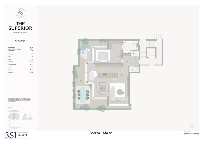 Im Zusammenspiel klarer Linien und präzise gesetzter Details entsteht die architektonische Qualität von THE SUPERIOR. Jede Entscheidung folgt einem übergeordneten Prinzip: Reduktion, Dauerhaftigkeit und Materialität. Die Innenräume überzeugen durch sorgfältig ausgewählte Oberflächen, die Ruhe ausstrahlen und zugleich Tiefe entwickeln. Eichenparkett bringt natürliche Wärme in die Räume, während großformatige Verglasungen Licht und Weitblick selbstverständlich integrieren. Auch in den Bädern setzt sich diese Klarheit fort. Hochwertiges Feinsteinzeug trifft auf fein ausgeführte Sanitärobjekte und schafft eine Atmosphäre, die zurückhaltend und zugleich anspruchsvoll wirkt. Technik versteht sich hier als diskrete Unterstützung. Split-Kühlgeräte sorgen für angenehme Temperaturen, ohne in Erscheinung zu treten. Elektrisch gesteuerte Beschattungselemente regulieren Licht und Atmosphäre im Hintergrund, während die Video-Gegensprechanlage Sicherheit und Privatsphäre gewährleistet.