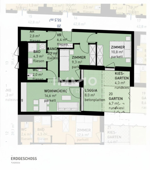 - Jede Wohnung mit privater Freifläche (Loggia, Balkon, Terrasse, Eigengarten)