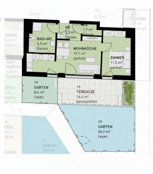 - Jede Wohnung mit privater Freifläche (Loggia, Balkon, Terrasse, Eigengarten)
