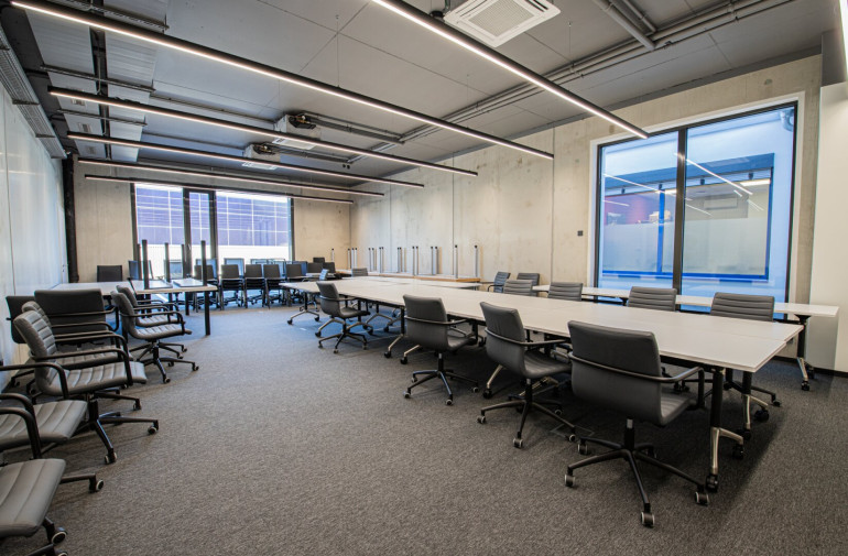 Der hochwertig ausgestattete Veranstaltungsraum mit modernster Medientechnik eignet sich ideal für Workshops, Präsentationen und Networking-Events. Dank modularer Möblierung und barrierefreiem Zugang lässt sich der Raum flexibel an unterschiedliche Nutzungskonzepte anpassen.