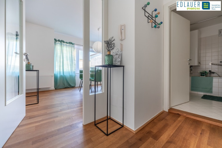 Die Wohnung wird über das Vorzimmer betreten. Vom Vorzimmer aus gelangt man in die Wohnküche welches den zentralen Mittelpunkt der Wohnung darstellt. Von hier aus gelangt man in das Zimmer, das Badezimmer mit WC sowie zum Abstellraum.